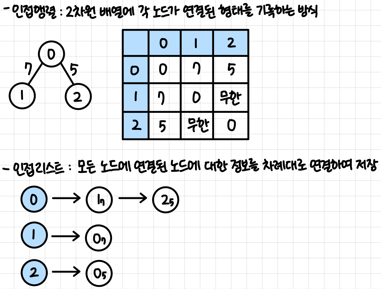 - ์ธ์ ๋ฆฌ์คํธ: ๋ฆฌ์คํธ๋ก ๊ทธ๋ํ์ ์ฐ๊ฒฐ ๊ด๊ณ๋ฅผ ํํํ๋ ๋ฐฉ์