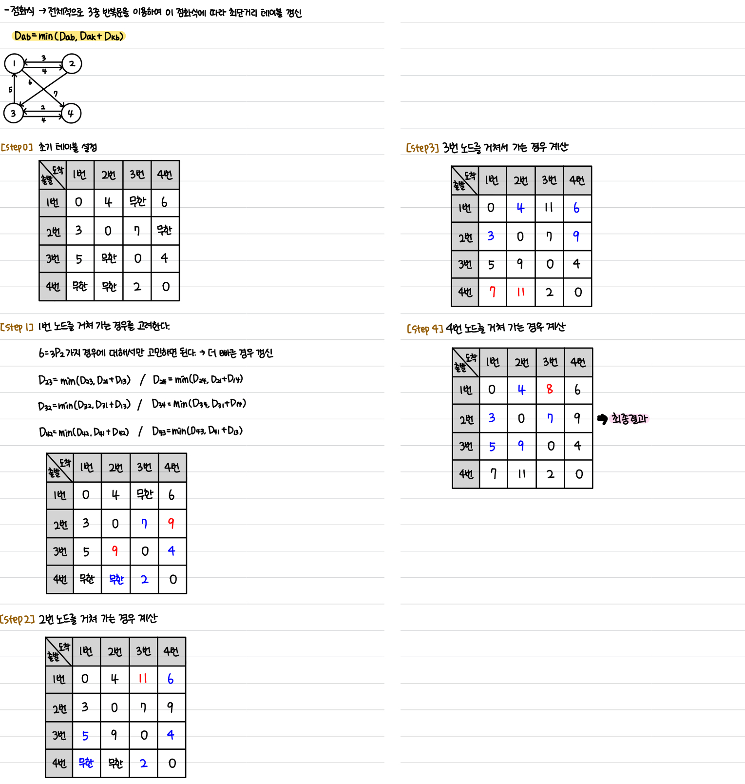 4) ํด๋น ๋ ธ๋๋ฅผ ๊ฑฐ์ณ ๋ค๋ฅธ ๋ ธ๋๋ก ๊ฐ๋ ๋น์ฉ์ ๊ณ์ฐํ์ฌ ์ต๋จ ๊ฑฐ๋ฆฌ ํ ์ด๋ธ ๊ฐฑ์
