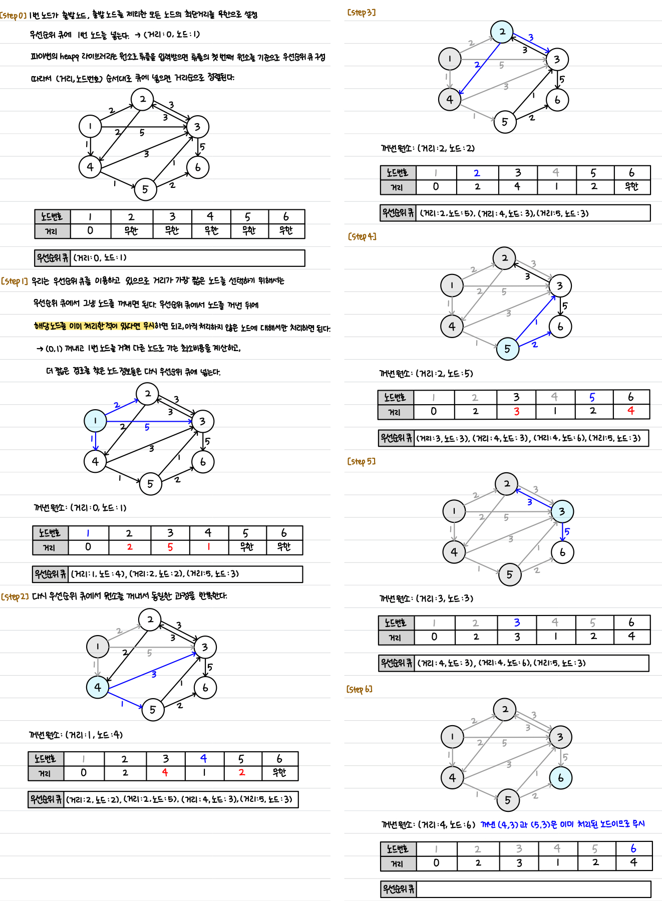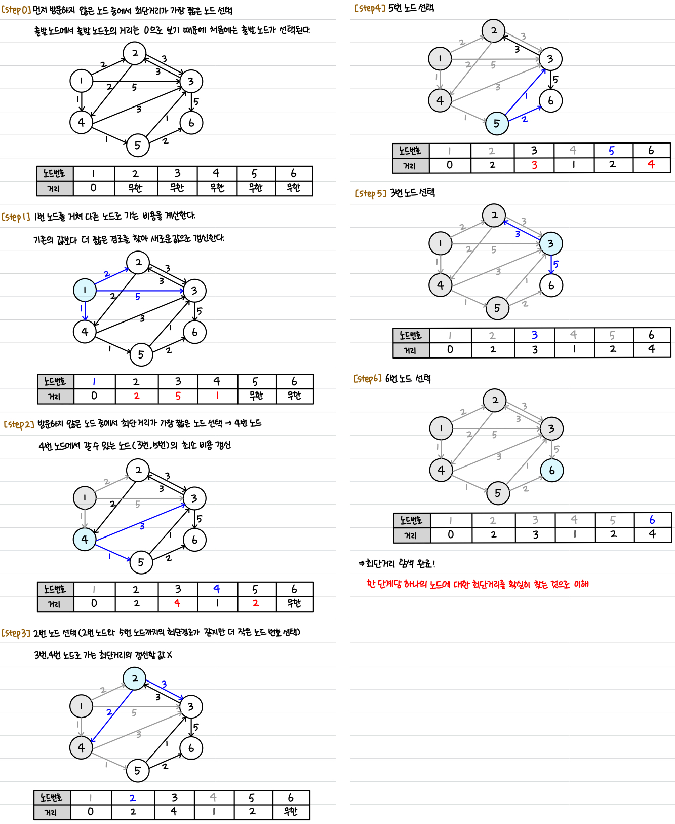 - ๋จ๊ณ๋ง๋ค '๋ฐฉ๋ฌธํ์ง ์์ ๋ ธ๋ ์ค์์ ์ต๋จ ๊ฑฐ๋ฆฌ๊ฐ ๊ฐ์ฅ ์งง์ ๋ ธ๋๋ฅผ ์ ํ'ํ๊ธฐ ์ํด