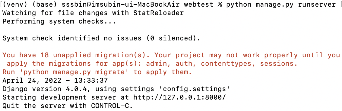 이제 http://127.0.0.1:8000/ 으로 접속해보면