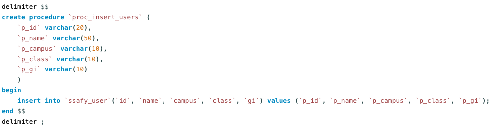 따라서 DELIMITER $$를 선언하고, 프로시저 작성이 끝날 경우 END $$로 프로시저의 끝을 알려야 한다. END $$로 끝나는 부분을 표시하고, 마지막에 DELIMITER를 세미콜론으로 바꿔준다.