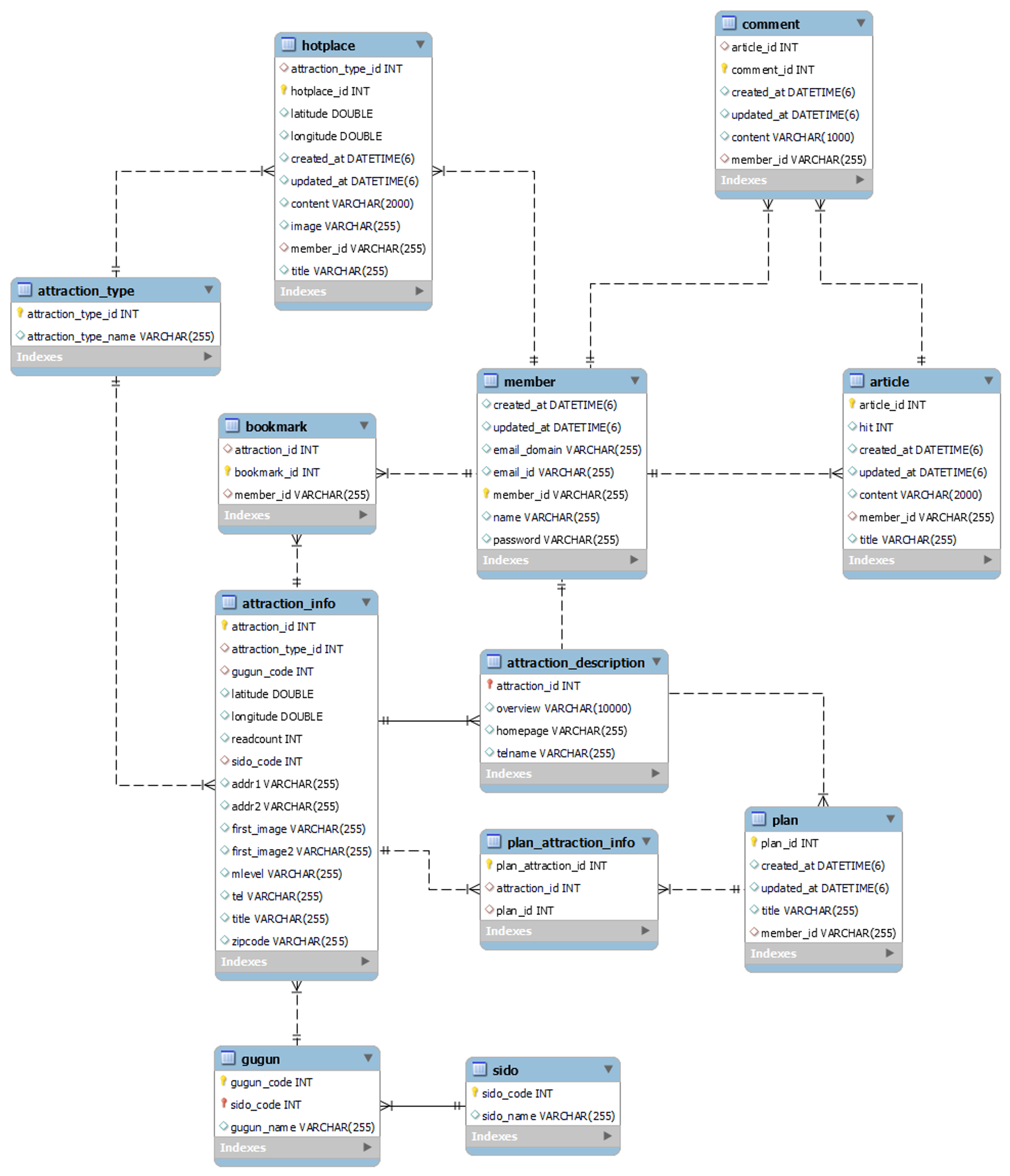 attraction_description ํ ์ด๋ธ๊ณผ attraction_info ํ ์ด๋ธ์ n:1์ ์ฐ๊ด๊ด๊ณ๋ฅผ ๊ฐ์ง๊ณ , attraction_description์ PK๊ฐ attraction_id