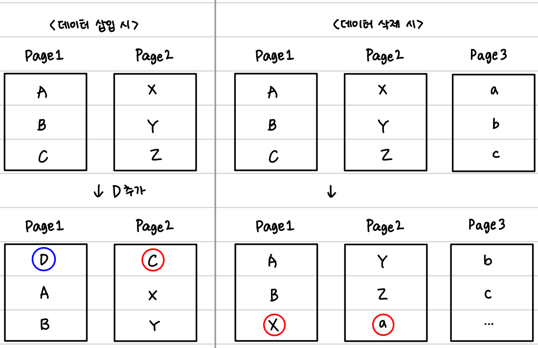 - 중간 페이지 이동이 불가능하고, 커서 관리가 필요하다.