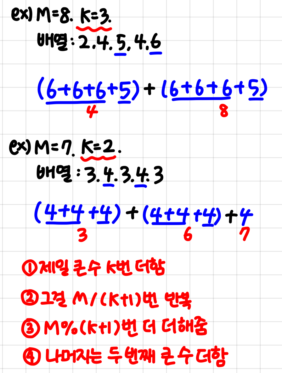 - ๊ฐ์ฅ ํฐ ์ K๋ฒ + ๋ ๋ฒ์งธ๋ก ํฐ ์ 1๋ฒ ๋ฐ๋ณต